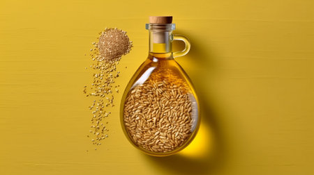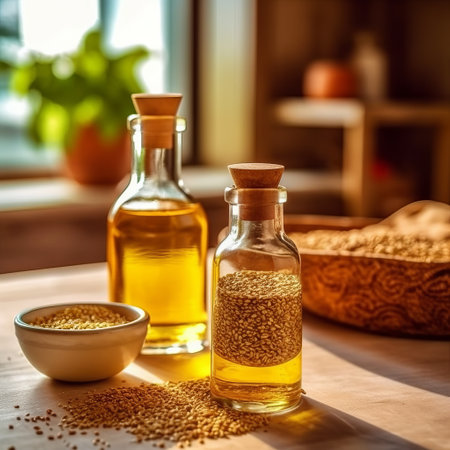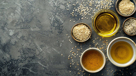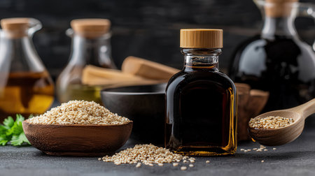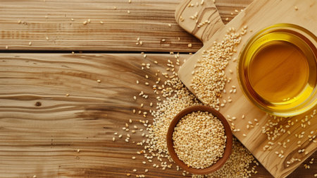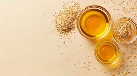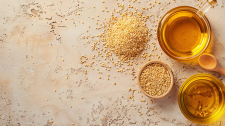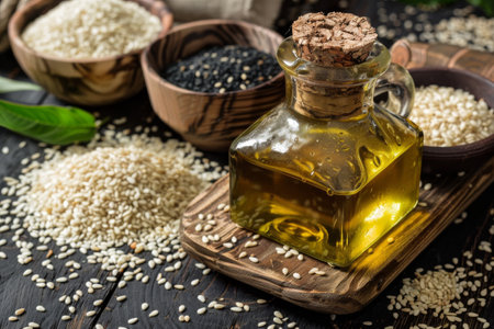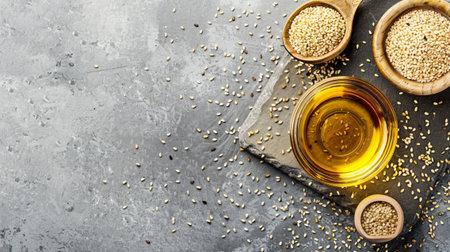 Explore this visually appealing composition featuring natural sesame oil and seeds. Ideal for healthy recipe inspiration, cooking visuals, and culinary art.