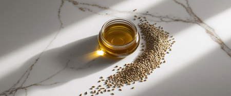 AI Generated. Glass Jar of Golden Oil Surrounded by Hemp Seeds on Marble Surface