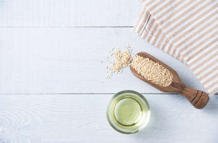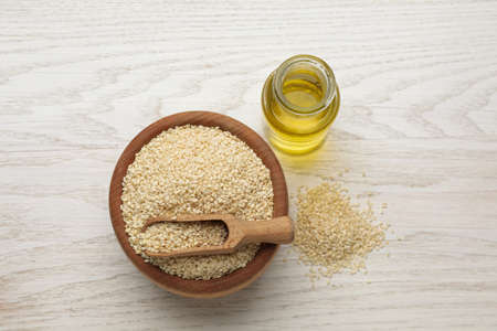 Sesame seed oil and bowl of sesame seeds on white wooden background. Top view
