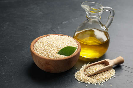 Healthy food and drink concept. Sesame oil and seeds on a rustic table. Copy space background