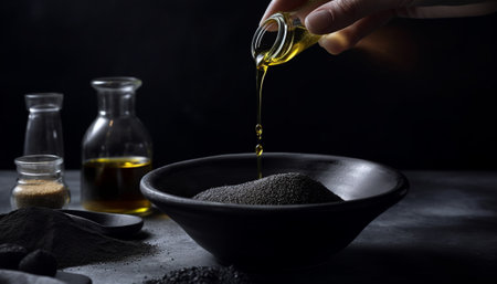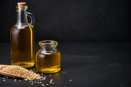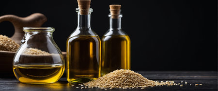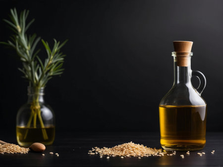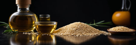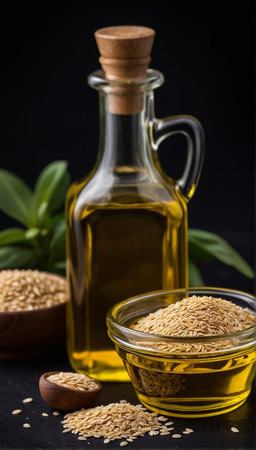 Discover the rich aroma and culinary versatility of sesame oil against a sleek black backdrop, where tradition meets innovation to elevate your culinary creations to new heights of flavor and sophistication.