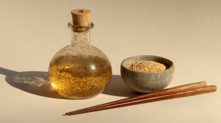 A glass bottle filled with oil stands beside a bowl of sesame seeds and wooden chopsticks. This minimalist setup highlights natural ingredients for cooking or dining.