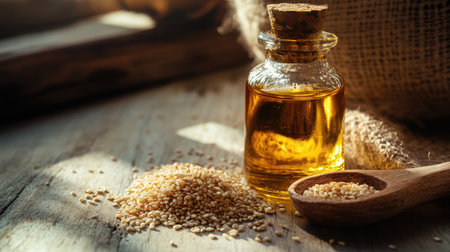 This image features a glass bottle filled with golden sesame oil next to raw sesame seeds on a rustic wooden table, illuminated by natural light.