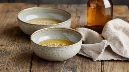 This image features two rustic bowls filled with olive oil and sesame seeds, positioned on a textured wooden table, complemented by a glass bottle.
