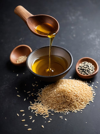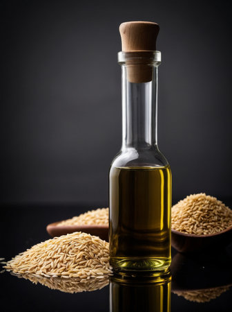 Biological rice oil, healthy eating ingredient, vegan and vegetarian food.