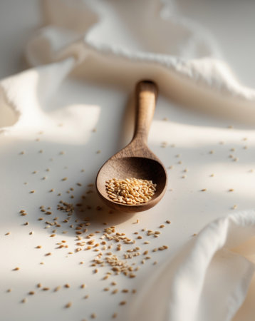 AI Generated. Natural Wooden Spoon with Sesame Seeds Captured in a Simple Yet Elegant Setting