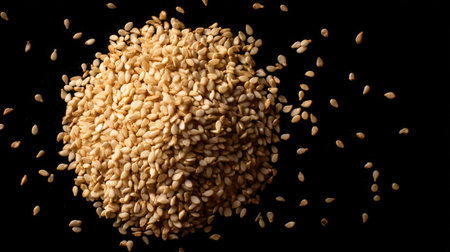 This close-up image showcases raw sesame seeds on a black background, emphasizing their texture and natural color variations, ideal for culinary uses.