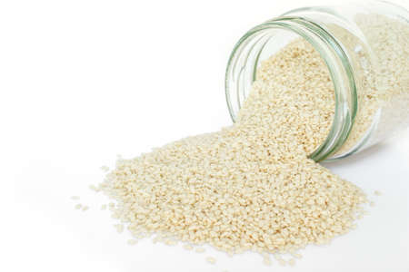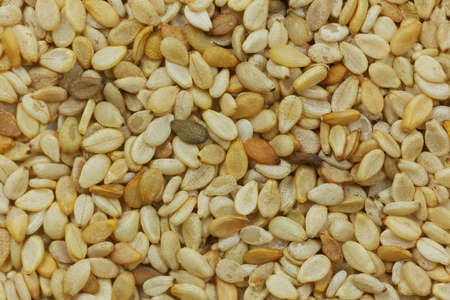 Closeup of white sesame seeds background. Top view. Studio shot.