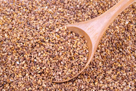 Organic fresh raw sesame seeds, in wooden spoon on bamboo cutting board
