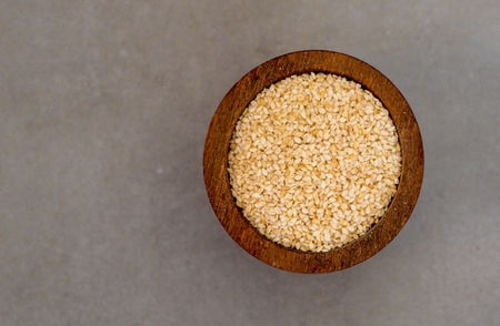 Sesame seeds in a wooden bowl on stone gray background. Healthy food and drink concept