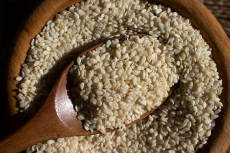 White sesame seeds in wooden spoon on pile of white sesame seeds, top view.