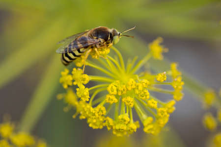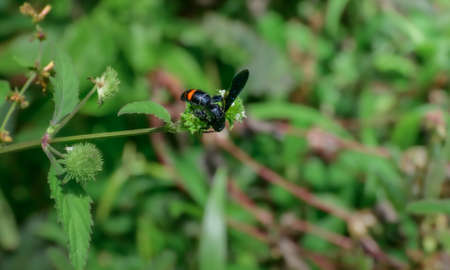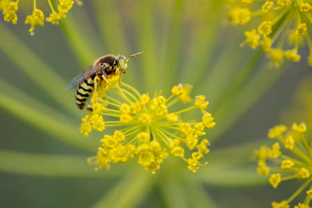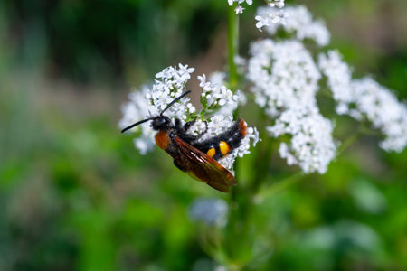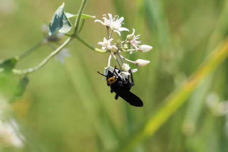The large Scolia wasp collects nectar on the inflorescence of a flower