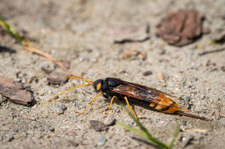 Closeup of a giant woodwasp (Uroceras gigas) resting on the ground, sunny day in summer in the Austrian alps