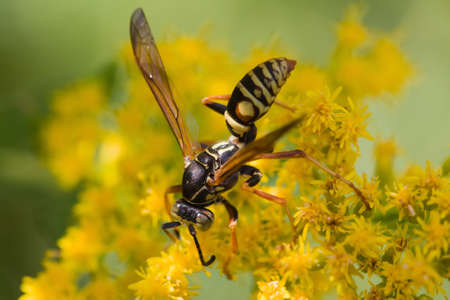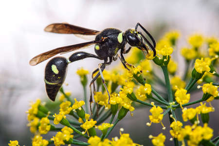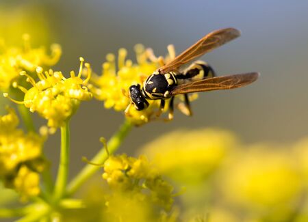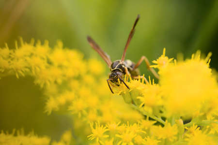 Wasp on yellow flower in nature. macro