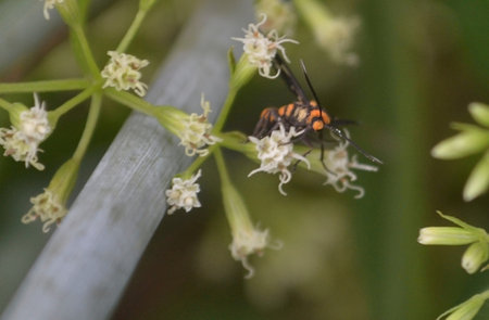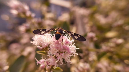 A moth is perched on a wildflower. This insect has the scientific name Euchromia sp.
