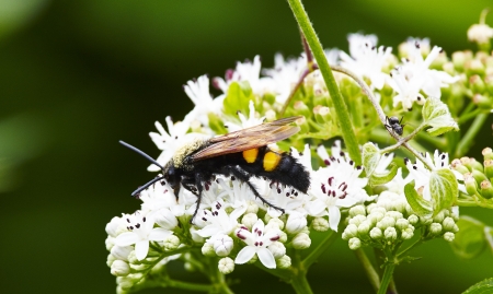 Scolia hirta (Hymenoptera, Scoliidae) sitting on a white flower, sunny day in summer, Vienna (Austria)