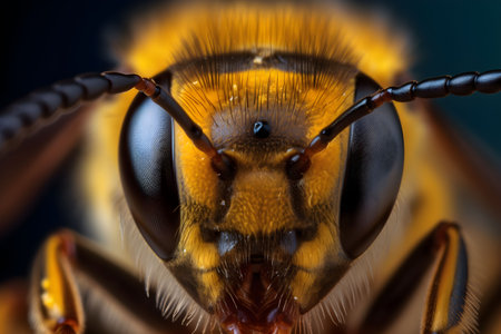 A stunning macro shot capturing the intricate details of a yellow and black insects face showcasing its large eyes and textured surface.