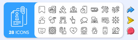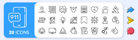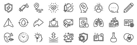 Depression treatment, Patient and Pencil line icons pack. Share, Message, Paper plane icons. Swipe up, Time management, Idea web icon. Internet book, Place, Manual pictogram. Vector
