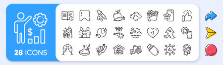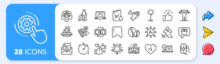 Buildings, Execute and Three fingers line icons pack. Share, Message, Paper plane icons. Champagne glass, Tea cup, World brand web icon. Idea lamp, Air conditioning, Inclusion pictogram. Vector