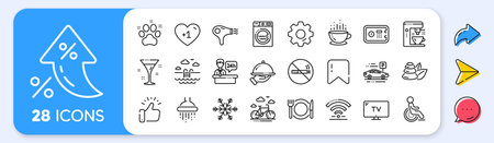 Hotel service line icons. Interest rate, AI generate, Inflation icons. Wi-Fi, Air conditioning and Coffee maker machine. Spa stones, swimming pool and bike rental icons. Vector