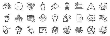 Smartphone protection, Cash back and Return package line icons pack. Share, Message, Paper plane icons. Cursor, Headphones, Vegetables web icon. Bid offer, Smile chat, Reject medal pictogram. Vector