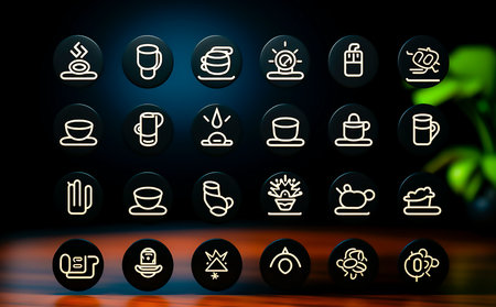 Vibrant modern digital icons on a dark background, showing various topics from photography to communication in a creative arrangement.