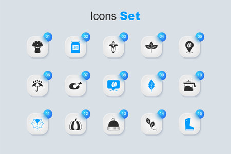 Set Leaf Roasted turkey or chicken Jam jar Chestnut Waterproof rubber boot Teapot Mushroom and Location with leaf icon. Vector.