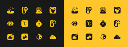Set Tornado Water drop Compass Day night cycle Celsius Rainbow with cloud Sunset and Thermometer icon. Vector.