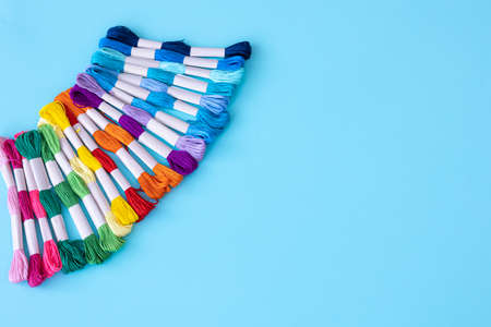 Threads of different colors on a blue background.