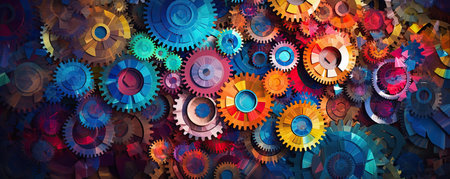 An array of colorful machine gears and cogs in vibrant tones showcases a modern industrial art aesthetic, ideal for creative projects or backgrounds.