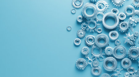 This image showcases a diverse arrangement of transparent gears and cogs on a soft blue background. Ideal for industrial, technology, or creative projects.
