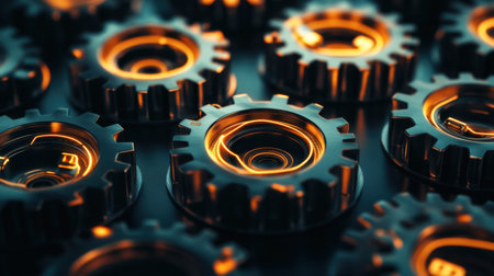 A captivating arrangement of metallic gears illuminated by a glow, set against a dark surface, showcasing intricate details and a stark industrial aesthetic.