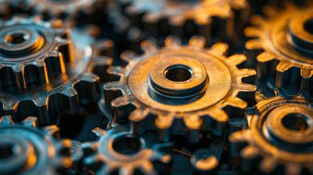 Close up view of complex interlocking industrial gears working together in a seamless mechanism, showcasing the beauty of engineering and precision