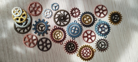 A vibrant and detailed layout featuring assorted mechanical gears and clock components against a bright background. Ideal for industrial design or technical illustrations.