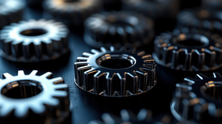 This close-up image captures the intricate details of metallic gears in motion, showcasing the precision and engineering behind machinery and industrial applications.