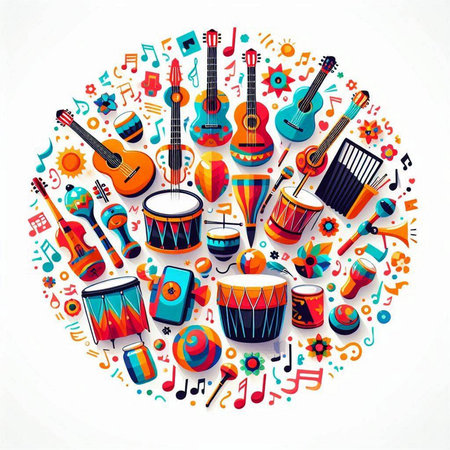 This vibrant image showcases a collection of musical instruments, including a guitar, saxophone, and drums, set against a colorful background. Perfect for artistic projects.
