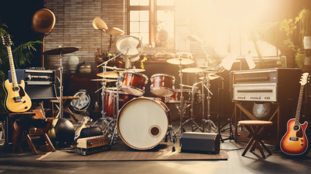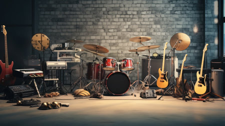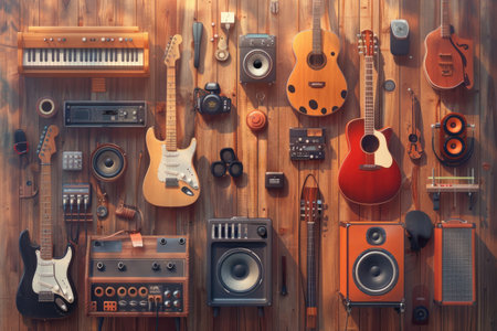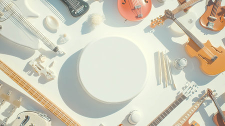 This image captures a stunning collection of musical instruments, arranged gracefully in a modern studio. Elegant lighting enhances the artistic ambiance, inviting creativity and imagination.