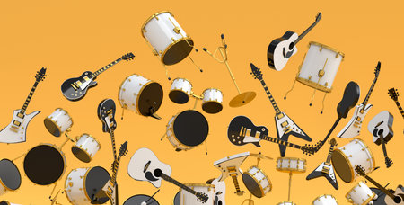 Many of flying acoustic guitars, drums with metal cymbals or drumset isolated on yellow background. 3d render of musical percussion instrument, drum machine and drumset