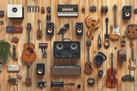 Enjoying Music with Instruments and Audio Equipment on a Wooden Background, Featuring People Engaged in Music AI