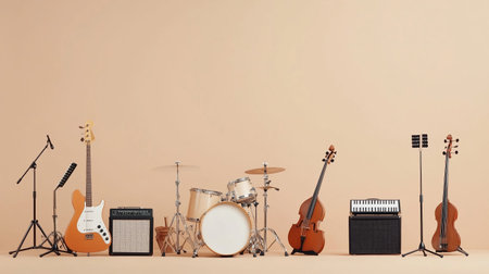 A collection of musical instruments arranged neatly on a beige background, showcasing guitars, a drum set, and string instruments