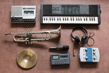Group of musical instruments including a guitar, drum, keyboard, tambourine. Top view