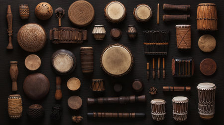 This image features an assortment of traditional drums and percussion instruments arranged on a dark background, highlighting the craftsmanship and variety within musical heritage.