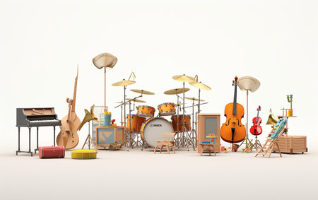 A vibrant arrangement of musical instruments designed for a modern artistic setting. Featuring a saxophone, drums, piano, and cello, the scene captures creativity and design. Perfect for music lovers and artistic themes.