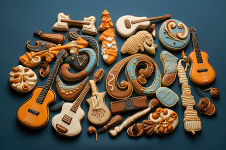 Musical instruments on a blue background. Acoustic guitar, ukulele, guitar, gingerbread.
