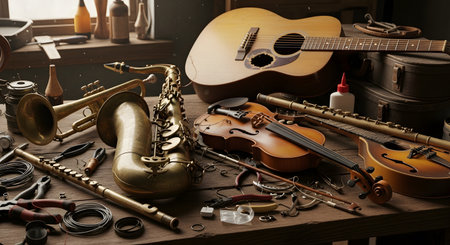 A collection of various vintage musical instruments, including a saxophone, violin, guitar, flute, and trumpet, are gathered on a wooden workbench in a luthier's or repair shop. Tools are scattered around, suggesting ongoing maintenance or creation. The warm lighting creates a nostalgic and artistic atmosphere.