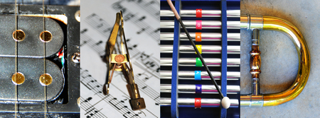 Photographic letters form the word BAND. Photographs are of guitar, music sheet and clip, xylophone and trombone.