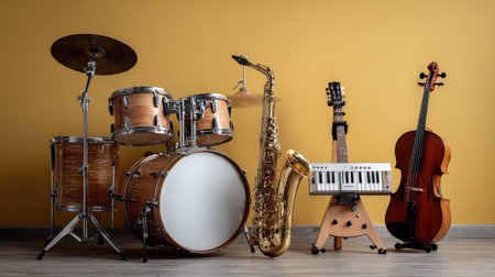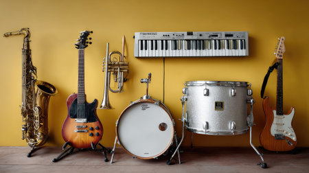 A vibrant arrangement of musical instruments including a drum set, saxophone, guitar, electronic piano, and violin on a bright yellow wall, perfect for creative projects.