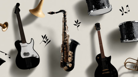 This vibrant image features a stunning arrangement of musical instruments including a saxophone, electric guitar, drums, and trumpet. The minimalist background highlights the beauty and creativity of music, making it ideal for artistic projects, themes, or celebrations.