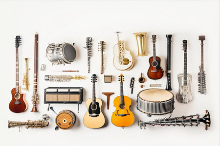 Collection of various musical instruments and notes arranged on a white background, perfect for showcasing creativity and artistry in music-related projects.