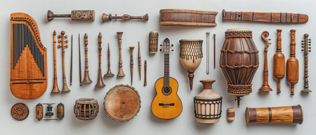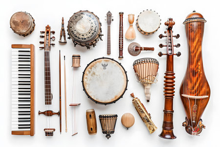 An expansive arrangement of diverse musical instruments showcased on a white background, highlighting the beauty of craftsmanship and cultural diversity.